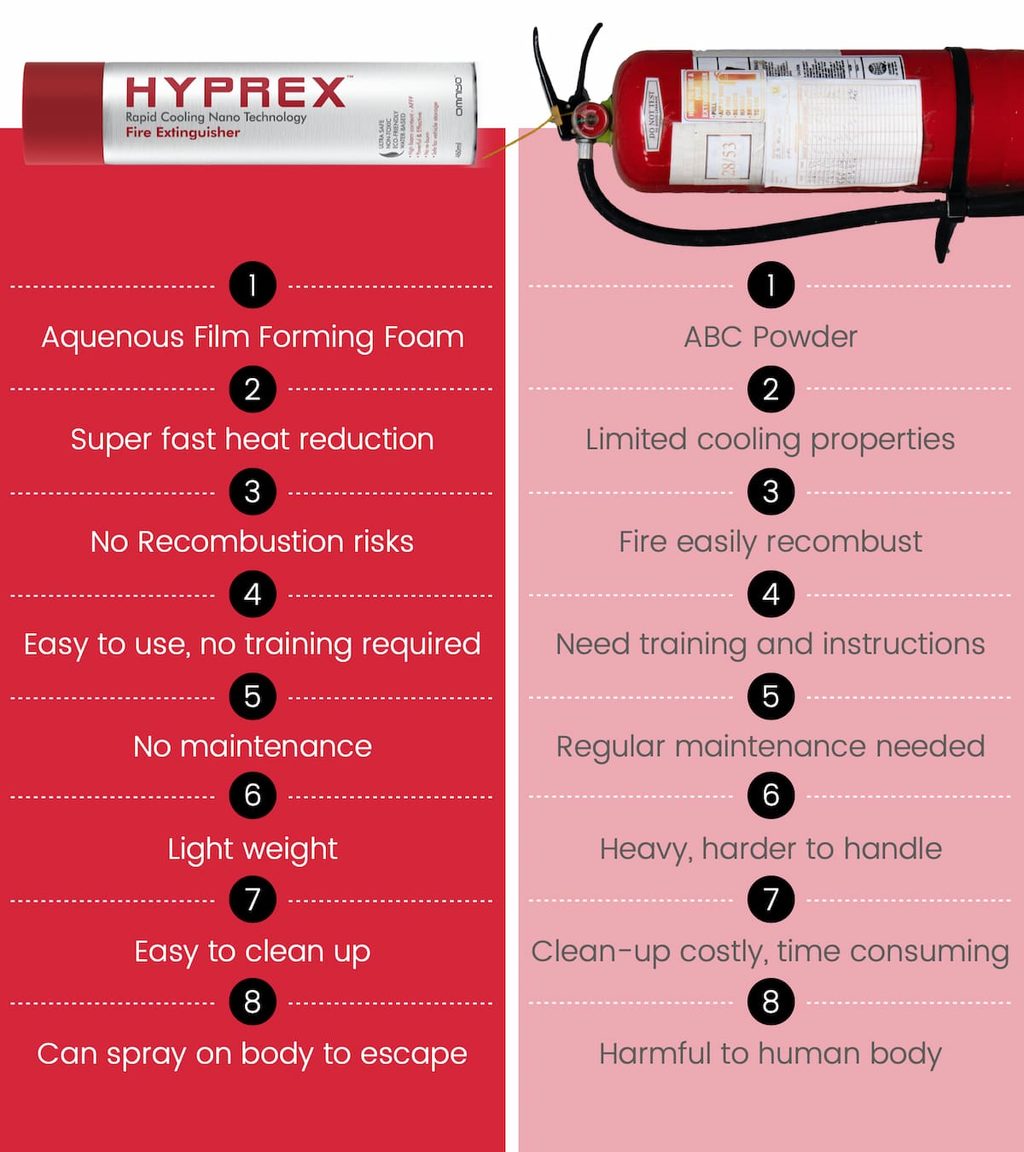 When comparing a Hyprex fire extinguisher with a traditional 3 kg ABC powder extinguisher, Hyprex wins every time.